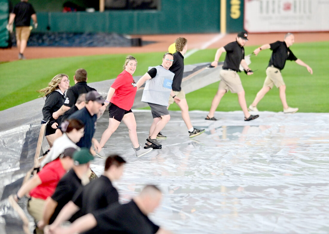 Mirror photo by Patrick Waksmunski The Peoples Natural Gas Field crew pull the tarp in preparation of the 7:50 p.m. first pitch after a rain and lightning delay.