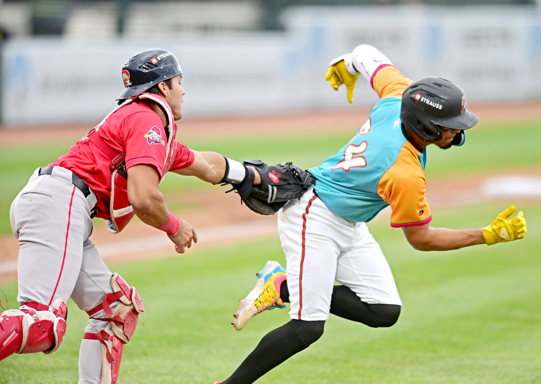- Mirror photo by Patrick Waksmunski Curve’s Jesus Castillo is tagged out by Portland catcher Nate Baez after Baez dropped the third strike.
