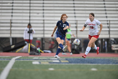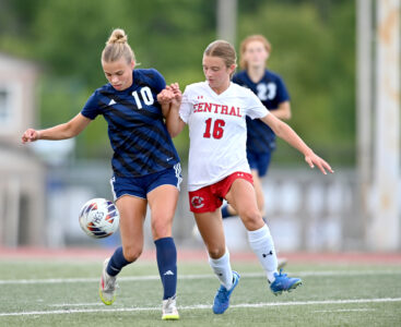 - Mirror photo by Patrick Waksmunski Hollidaysburg’s Kate Steiner shields the ball from Central’s Addison Long.