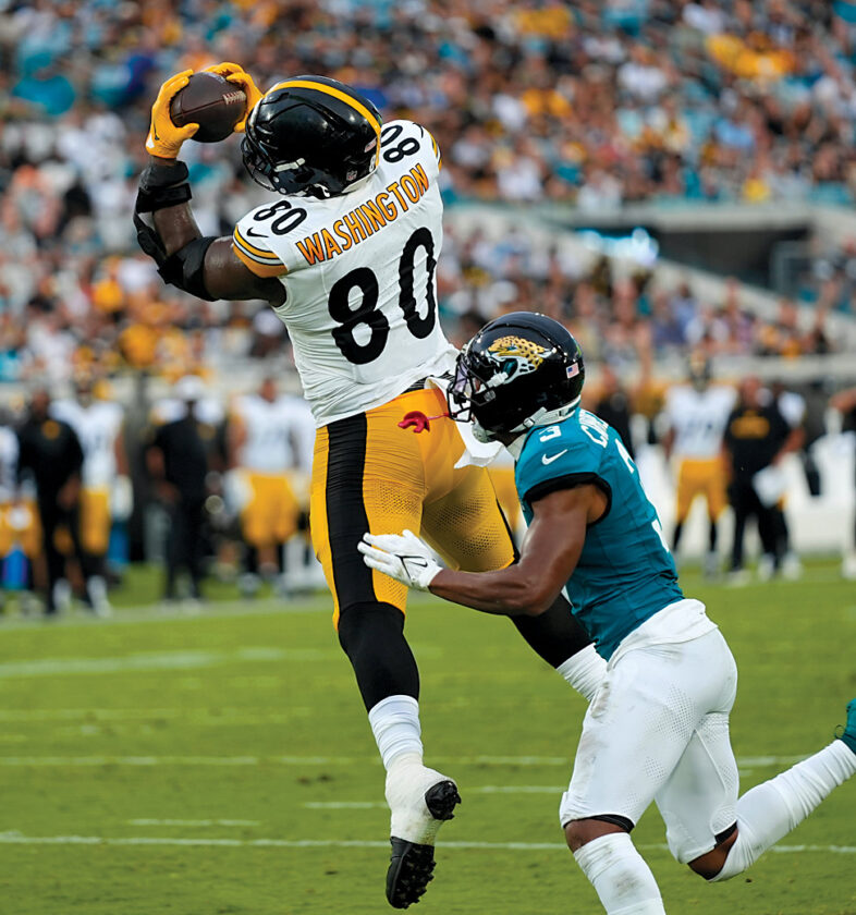 - Pittsburgh Steelers tight end Darnell Washington (80) makes a touchdown catch against Jacksonville Jaguars’ Tyson Campbell (3) Aduring the first half of an NFL preseason football game, Saturday, Aug. 9, 2025, in Jacksonville, Fla. (AP Photo/John Raoux)