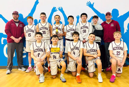The Altoona seventh grade boys basketball team won the Centre Showdown Tournament. Team members include (from left): First row— Carson Beaver, Brayden Kaack, Branson Trostle, Jackson Winterburn, Matthew Meilnik. Second row—Coach Skylar Mignogna, Kason Gamber, Braeson McGinnis, Samir Robles, Micah Farabaugh, Camden Cobler, Kade Wasovich and coach Rick Dickinson.