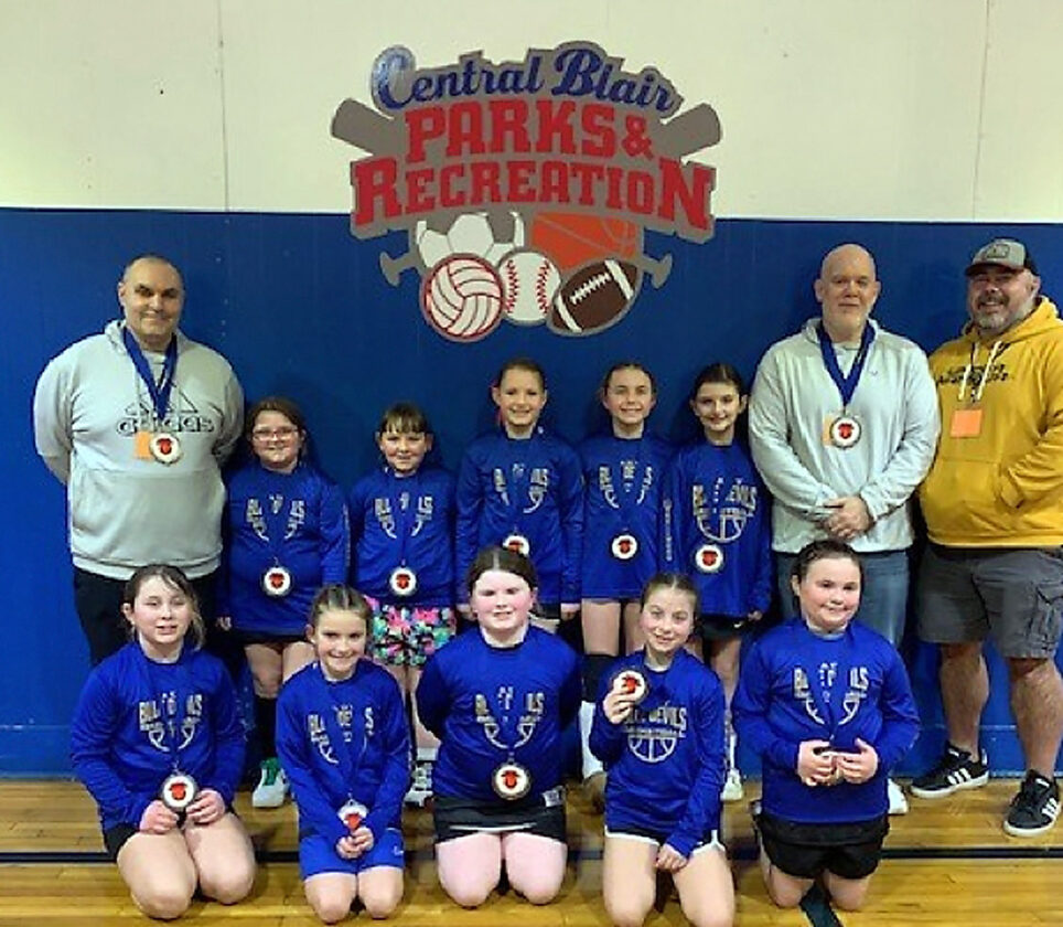 Bellwood won the 2026 CBRC Elementary Basketball championship for grade 3 girls. Team members include (from left): First row–Felicity Barr, Kinley Hoffer, Lena McNelis, Mileena Knisely, Zaydah Kustaborder. Second row–Coach Brian Warburton, Riley Warburton, Abigail Strayer, Ava Diehl, Josie Miller, Bella Stetter, coach Pat McNelis, coach Chris Miller.