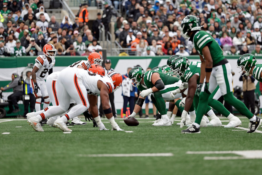 New York Jets center Josh Myers (71) a the line of scrimmage during an NFL football game against the Cleveland Browns, Sunday, Nov. 9, 2025, in East Rutherford, N.J. (AP Photo/Adam Hunger)