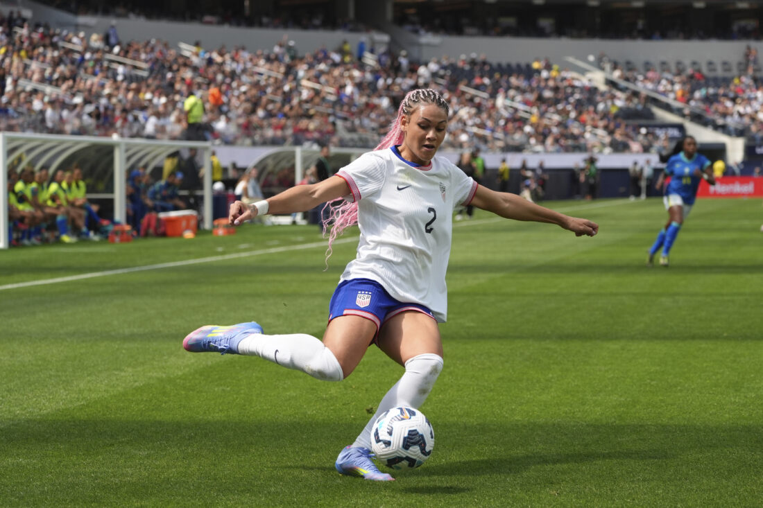 United States forward Trinity Rodman (2) passes the ball during the first half of a women's international friendly soccer match against Brazil in Inglewood, Calif. Saturday, April 5, 2025. (AP Photo/Jae C. Hong)