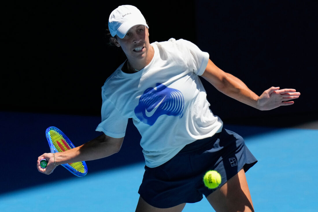 Madison Keys of the United States plays a forehand return during a practice session ahead of the Australian Open tennis championship in Melbourne, Australia, Saturday, Jan. 17, 2026. (AP Photo/Dar Yasin)