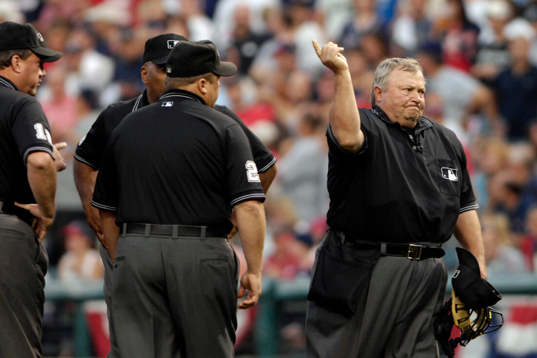 FILE - Umpire Bruce Froemming, right, signals a home run for New York Yankees' Johnny Damon after conferring with his crew during the first inning of Game 1 of an American League Division Series baseball game against the Cleveland Indians, Oct. 4, 2007, in Cleveland. (AP Photo/Ken Blaze, File)