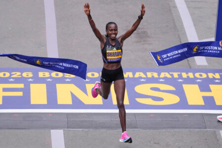 - Marcel Hug, of Switzerland, breaks the tape to win the men’s wheelchair division at the Boston Marathon, Monday, April 20, 2026, in Boston. (AP Photo/Charles Krupa)