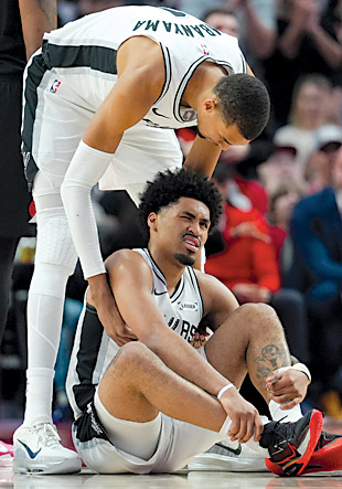 San Antonio Spurs forward/center Victor Wembanyama helps guard Dylan Harper after a play during the first half in Game 4 of a first-round NBA basketball playoffs series against the Portland Trail Blazers, in Portland, Ore., Sunday, April 26, 2026. (AP Photo/Jenny Kane)