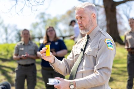 Chris Kemmerer, DCNR Bureau of State Parks education and interpretation section chief, at a press conference launching the DCNR America250PA GeoTrail at Codorus State Park in York County, Pa. Created in honor of America's 250th, the GeoTrail guides visitors to 25 state parks, where themed geocaches share stories from Pennsylvania's past through a technology driven scavenger hunt.