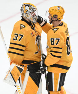 Pittsburgh Penguins center Sidney Crosby (87) congratulates goalie Arturs Silovs (37) after beating the Florida Panthers 5-2, in an NHL hockey game, Sunday, April 5, 2026, in Pittsburgh. (AP Photo/Philip G. Pavely)