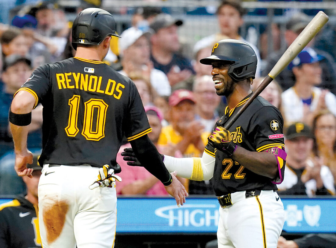 The Associated Press Bryan Reynolds (left) is greeted by Andrew McCutchen after scoring a run in a game earlier this month.
