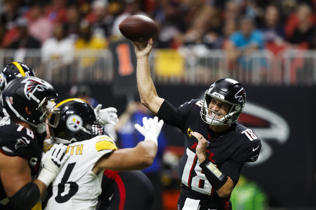 Atlanta Falcons quarterback Kirk Cousins (18) throws under pressure against the Pittsburgh Steelers during the first half of an NFL football game Sunday, Sept. 8, 2024, in Atlanta. (AP Photo/Butch Dill)