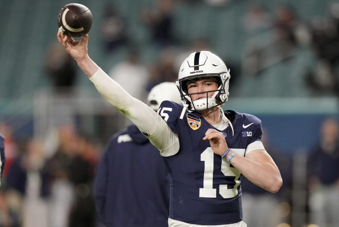 - Penn State quarterback Drew Allar (15) warms up before the Orange Bowl College Football Playoff semifinal game, Thursday, Jan. 9, 2025, in Miami Gardens, Fla. (AP Photo/Lynne Sladky)