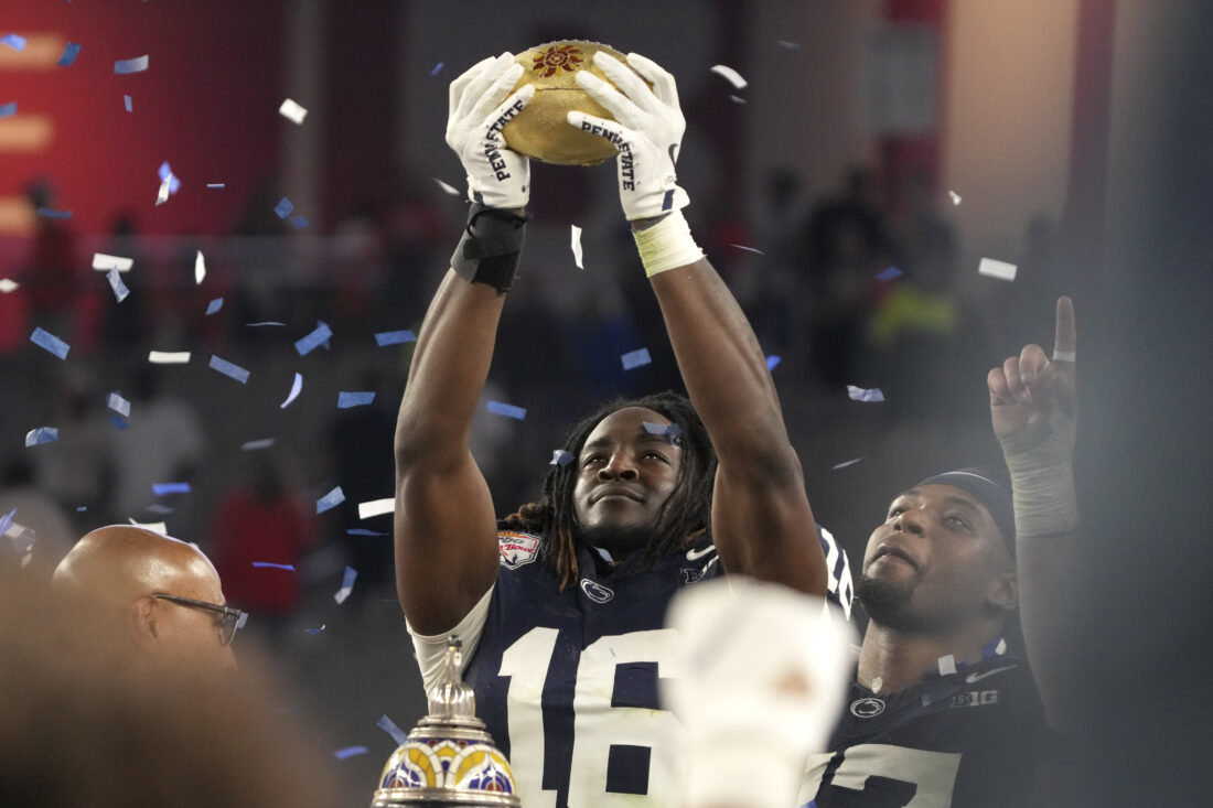 - Penn State tight end Khalil Dinkins (16) celebrates after the Fiesta Bowl College Football Playoff game against Boise State, Tuesday, Dec. 31, 2024, in Glendale, Ariz. (AP Photo/Rick Scuteri)