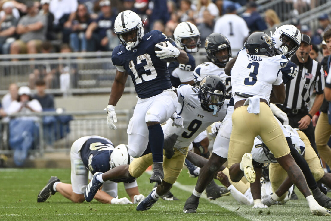 Penn State running back Kaytron Allen (13) eludes Florida International defensive back Demetrius Hill (3) on his way to score a touchdown during the fourth quarter on Saturday at Beaver Stadium. The Associated Press