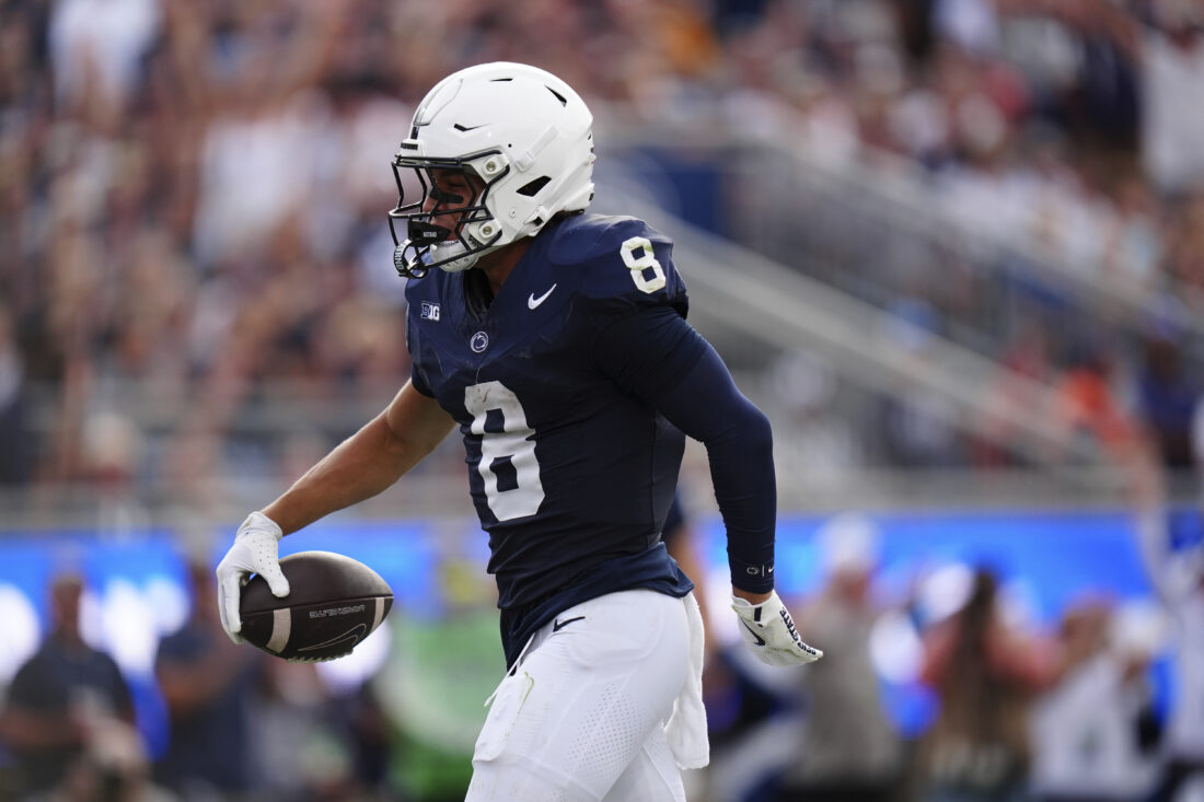 Penn State wide receiver Trebor Peña (8) scores a touchdown during the second quarter of an NCAA college football game against Villanova, Saturday, Sept. 13, 2025, in State College, Pa. (AP Photo/Jared Freed)