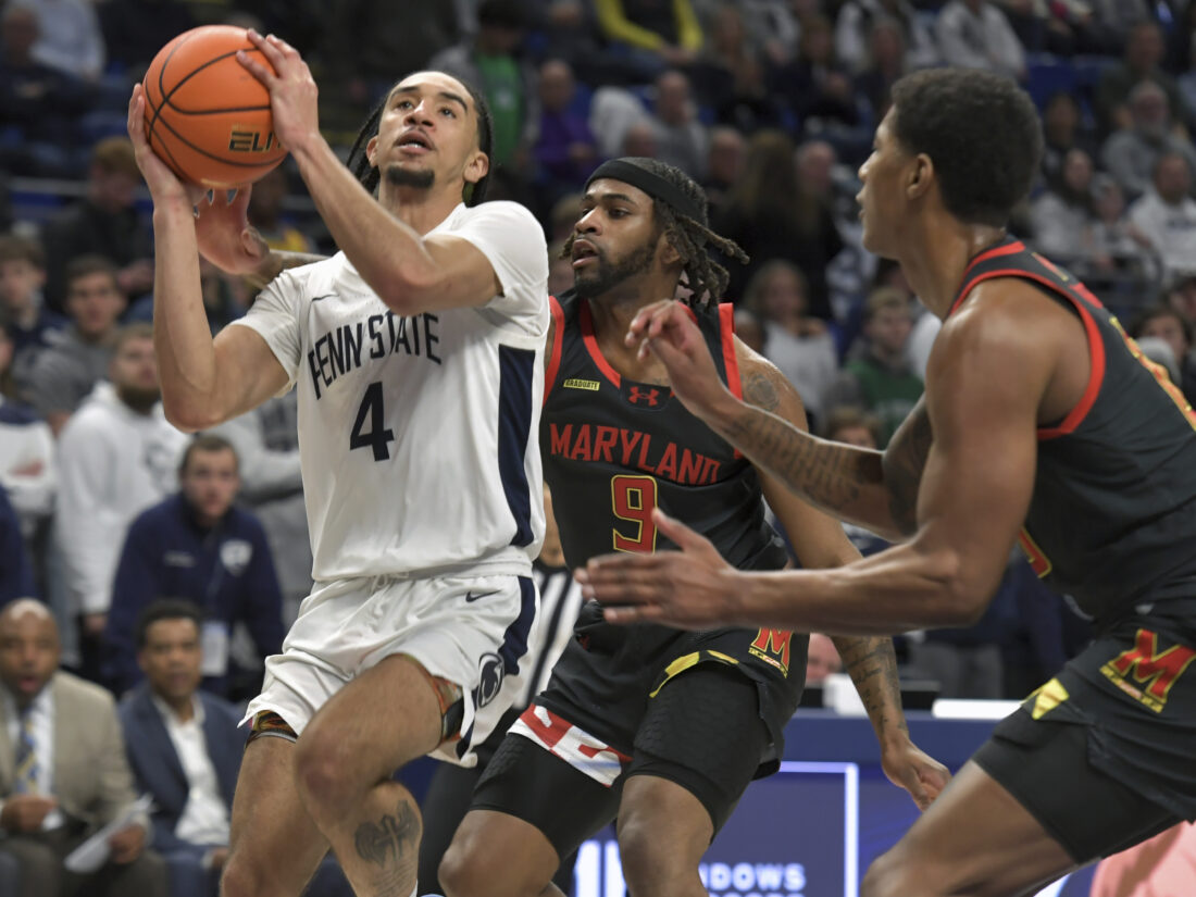 Penn State's Freddie Dilione V (4) drives to the basket past Maryland's Selton Miguel (9) during the first half of an NCAA college basketball game Saturday, March 1, 2025, in State College, Pa. (AP Photo/Gary M. Baranec)