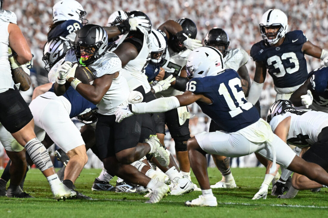 Oregon running back Jordon Davison (0) scores a touchdown in front of Penn State safety King Mack (16) during the fourth quarter of their NCAA college football game, Saturday, Sept. 27, 2025, in State College, Pa. (AP Photo/Barry Reeger)