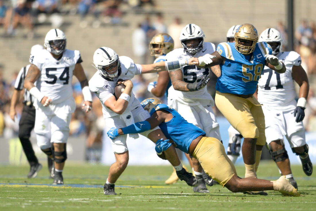 UCLA linebacker Jonjon Vaughns (6) tackles Penn State quarterback Drew Allar (15) during an NCAA football game on Saturday, Oct. 4, 2025, in Pasadena, Calif. (AP Photo/Kyusung Gong)