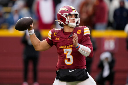 FILE - Iowa State quarterback Rocco Becht throws a pass during the second half of an NCAA college football game against Arizona State, Nov. 1, 2025, in Ames, Iowa. (AP Photo/Charlie Neibergall, File)
