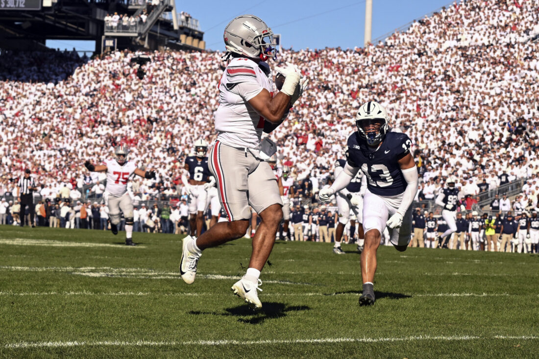 Ohio State wide receiver Emeka Egbuka (2) catches a touchdown pass in front of Penn State linebacker Tony Rojas (13) during the first quarter of an NCAA college football game, Saturday, Nov. 2, 2024, in State College, Pa. (AP Photo/Barry Reeger)