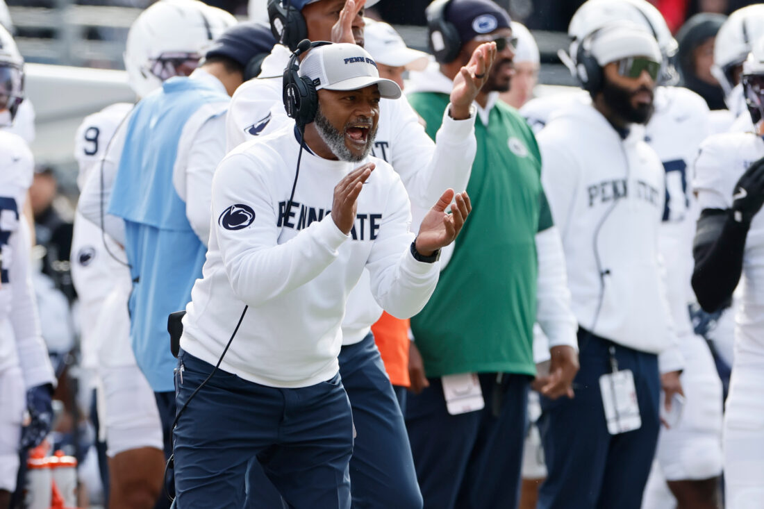 Penn State interim head coach Terry Smith instructs his team against Ohio State during an NCAA college football game, Saturday, Nov. 1, 2025, in Columbus, Ohio. (AP Photo/Jay LaPrete)