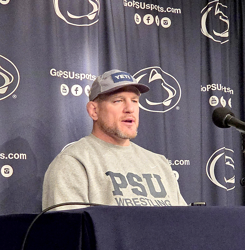 Mirror photo by Andy Stine Coach Cael Sanderson talks to the media about his Nittany Lions on Tuesday.