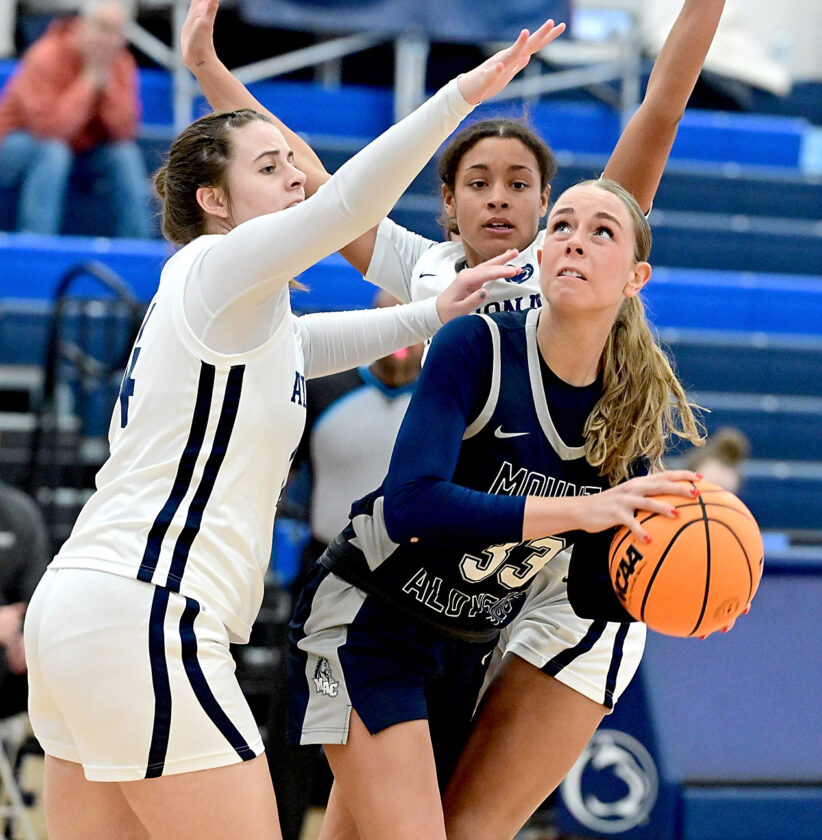 - Mirror photo by Patrick Waksmunski Mount Aloysius’ Molly Kosmack is pressured by Penn State Altoona’s Halle Kuzminski (left) and Avana Sayles.