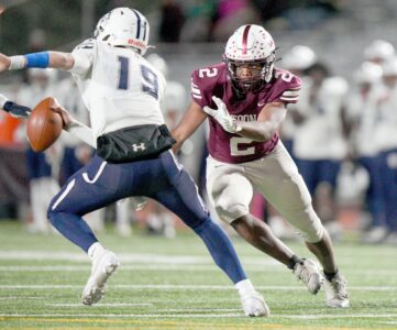 TyKear Davis puts pressure on Chambersburg QB Cam Green. Photo for the Mirror by Chuck Meyers