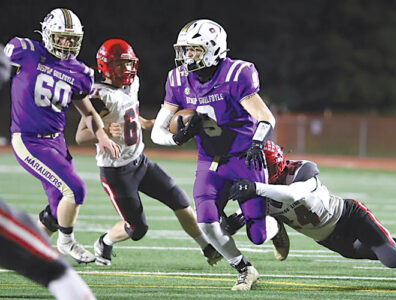 - Bishop Guilfoyle’s Keegan Hewitt runs up field against Purchase Line on Friday at Mansion Park. Photo for the Mirror by Jeremy Boland