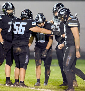 Mirror photo by Patrick Waksmunski Penn Cambria's Brady Jones (10) is congratulated on his TD by Benjamin Gorba (56) and Logan Price (55).