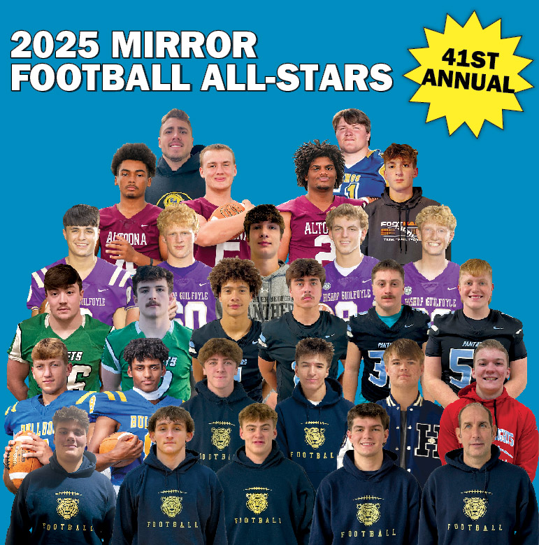 2025 Altoona Mirror high school football first-team all-stars, the Mirror’s 41st annual, include (from left): First row—Hollidaysburg’s Austin Harr, Joey Richardson, Josh Banks, player of the year; Cole DeLattre, Homer DeLattre, coach of the year. Second row—Claysburg-Kimmel’s Mason Campagna and Gavin Treon, Hollidaysburg’s Carter Muth, Kayden McCrystal and Jackson York, Cambria Heights’ Bryce Lewis. Third row—Juniata Valley’s Logan Harpster and Andrew Clark, Penn Cambria’s Blake Lilly, Brady Jones, Corbin Vinglish and Logan Price. Fourth row—Bishop Guilfoyle’s Tyson Lestochi and Rocco Cacciotti, Northern Bedford’s Zach Bowers, Bishop Guilfoyle’s Jake Kissell and Carter Boland. Fifth row—Altoona’s Michael Chisolm, Logan Wuckovich and Tykear Davis, Tyrone’s Eli Woomer. Sixth row—Bellwood-Antis’ Christian Jennings, Glendale’s Daniel Williams.