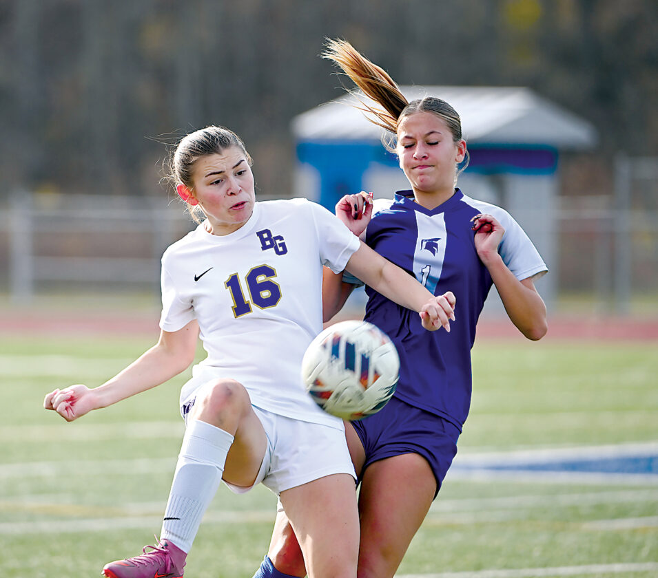 Photo for the Mirror by Roger Kerekes Bishop Guilfoyle’s Lily Sapp is able to get to the ball in front of McConnellsburg’s Marin Deshong during their PIAA Class 1A girls soccer quarterfinal match in Windber on Saturday.