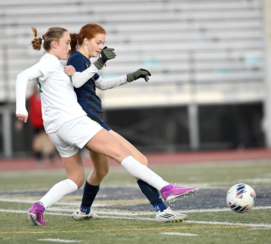 - 11/04/25 Mirror photo by Patrick Waksmunski / Hollidaysburg’s Bailey Stoehr has the ball stepped by South Fayette’s Harper Zapf.