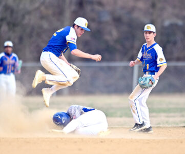 03/26/26 Mirror photo by Patrick Waksmunski / Williamsburg's Clayton McGregor slides under Claysburg-Kimmel shortstop Brayden Haney, advancing on a hit from Nolan Carper.