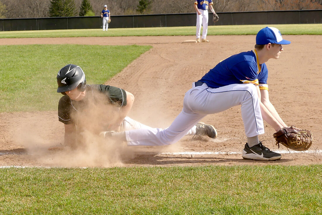 Mirror photo by Michael Boytim Tyrone’s Brayden Parsons is doubled up at first as Bellwood-Antis’ Curtis Shedlock scoops up the throw.