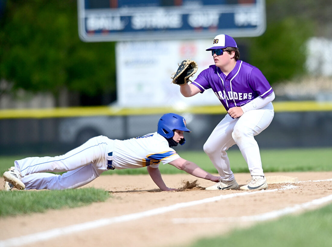 Bellwood-Antis’ Colin Gibbons dives back safely into first base Monday as Bishop Guilfoyle Academy’s Dane Lechner awaits the throw during the Blue Devils’ victory. See roundup on Page B3.