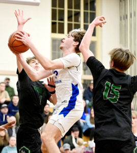 At right: Great Commission School’s Alex Guise puts up a shot with Blair County Christian’s Jonathan Marucci defending. GCS won both games. See roundup stories on Pages B4 and B5.