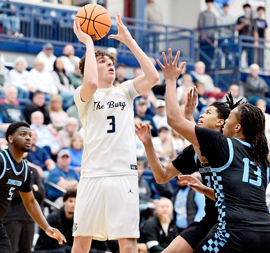 - 02/20/26 Mirror photo by Patrick Waksmunski / Hollidaysburg’s JJ Stultz looks to shoot over Greater Johnstown’s Kemmett Armstrong (center) and Amier Robinson.