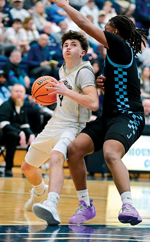 - 02/20/26 Mirror photo by Patrick Waksmunski / Hollidaysburg’s Wyatt Frazier is pressured by Greater Johnstown’s Amier Robinson.