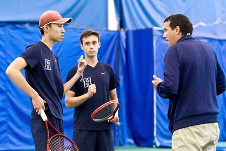 - Hollidaysburg coach Brian Denis talks to Felix Xu (left) and Garrett Bouchard during a break in action Wednesday afternoon. Mirror photo by Patrick Waksmunski