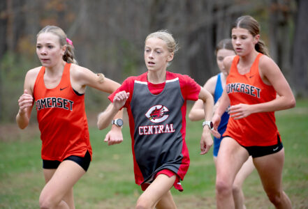 - Central’s Lanee Berkhimer runs alongside Somerset’s Libby Marteeny (right) and Emily Fisher Wednesday afternoon in Portage.