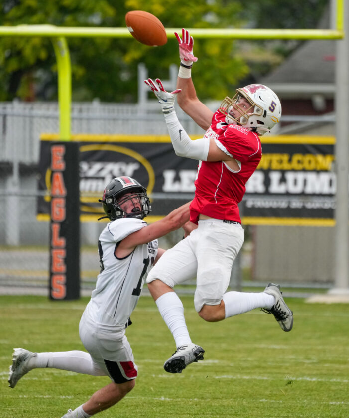 Dominic Yanoshak of Bishop Guilfoyle hauls in a deep pass for the South team. Photo for the Mirror by Chuck Meyers