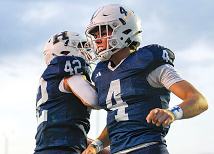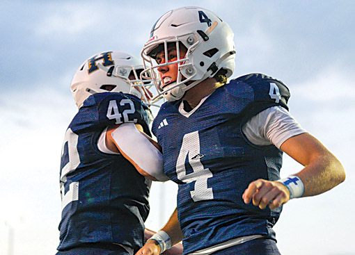 Cole DeLattre celebrates with Carter Muth after a touchdown. Photo for the Mirror by Chuck Meyers