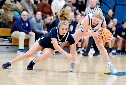 - Mirror photo by Patrick Waksmunski Bellwood-Antis’ Karlie Sweigert beats Hollidaysburg’s Kate Steiner to a loose ball.