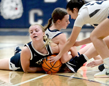 - Mirror photo by Patrick Waksmunski Hollidaysburg’s Makenna Weimert battles Bishop Carroll’s Adelyn Myers (center) and Sarah Miller for a loose ball.