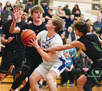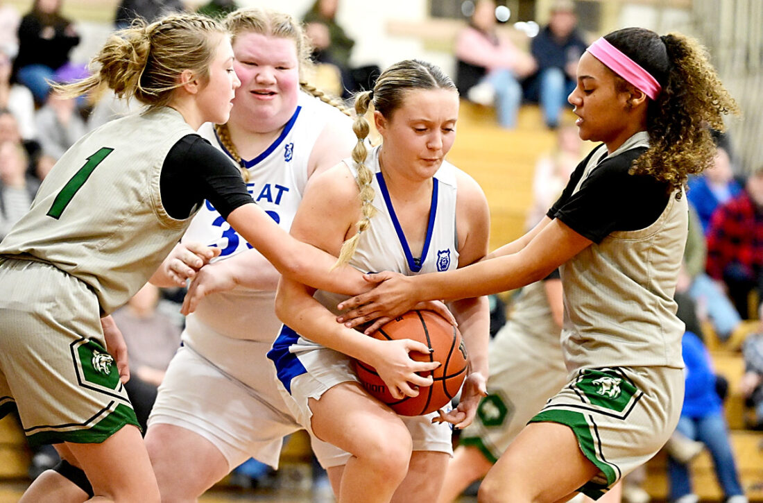 Mirror photo by Patrick Waksmunski Great Commission School’s Kayelynn Summers is smothered by Blair County Christian defenders Allison Hall (left) and Amyah Kenepp. GCS won, 49-28.