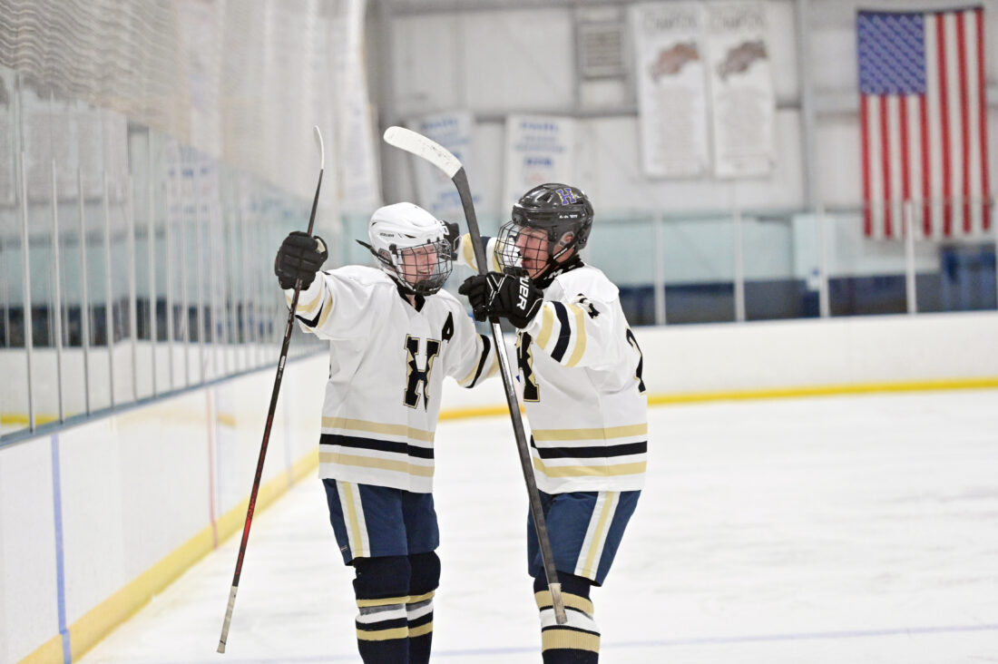 01/27/26 Mirror photo by Patrick Waksmunski / Hollidaysburg's Ty Fitzgerald (left) celebrates his goal with Marshall Martin.