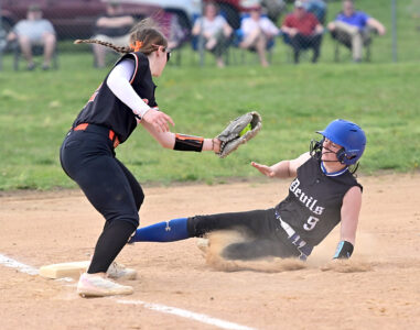 - Mirror photo by Patrick Waksmunski Bellwood-Antis courtesyrunner Izzy Higgins-Sweet advances on a passed ball under Tyrone third baseman Sage Harris.