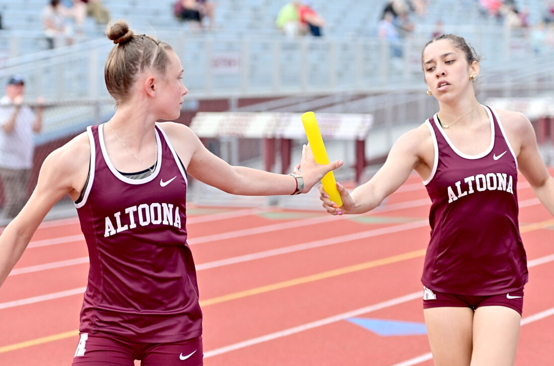 - Altoona’s Brionna Adams (right) hands the baton to Emma Etters during the second exchange of the 4×800 meter relay. Altoona won with a time of 9:47.31. Mirror photo by Patrick Waksmunski